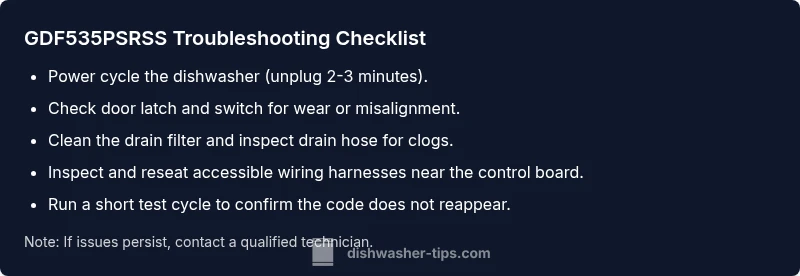 GDF535PSRSS can arise from several root issues, most of which are addressable by homeowners without heavy teardown. The most frequent culprits include a faulty door latch or door switch, which prevents the unit from starting as a safety precaution; a clogged or restricted drainage path, causing the machine to detect an overfill condition or poor pump operation; and power or wiring problems that sporadically trip safety circuits. Less common but possible are control board faults or sensor malfunctions that misread the machine’s status. Understanding these causes helps you prioritize fixes in order of likelihood and prevents unnecessary part replacements. Dishwasher Tips notes that starting with the simplest, least invasive fixes usually yields the best results, especially when the code is generated by a safety interlock or a reversible circuit fault.