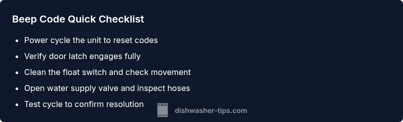 Beeping on a GE dishwasher is usually an alert signaling an error. Start with the simplest checks: verify the door latch is fully closed, confirm the float switch is free of debris, and inspect the water supply valve. If the beep persists, follow the diagnostic flow and step-by-step fixes for the most common causes.