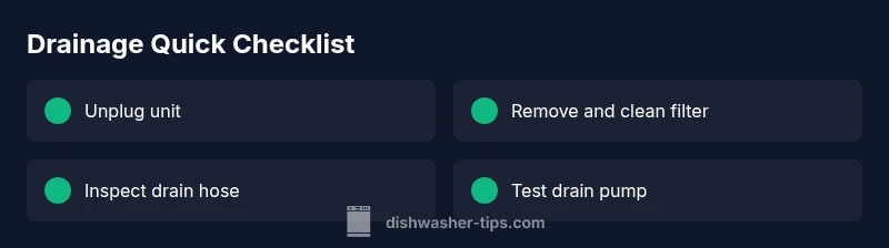 - Unplug the dishwasher and access the filter: Remove the lower rack and take out the filter assembly. Rinse the filter under warm water, using a soft brush to dislodge any stuck debris. Tip: Work over a towel to catch dropped parts. 2) Clean the sump and interior: Wipe away residue from the sump, spray nozzles, and interior walls. A damp cloth works well for stubborn spots. Tip: A soft brush helps remove baked-on gunk without scratching surfaces. 3) Clear the filter path and drain screen: Reinstall and ensure the screen sits properly so water can flow freely toward the pump. Tip: Check for cracks or warping that would allow debris to bypass the filter. 4) Inspect the drain hose: Disconnect from the disposal or waste line and run water through it. Look for obstructions; if you find one, remove it with a flexible straighten tool. Tip: Avoid using sharp objects that can puncture the hose. 5) Check the drain pump and impeller: If accessible, examine the impeller for obstruction and verify the impeller spins freely. Tip: If you hear grinding or see no movement, the pump may be failing and require replacement. 6) Reassemble and test: Reinstall the filter, reconnect hoses, restore power, and run a short cycle with no dishes to confirm drainage. Tip: Listen for the pump running and observe whether water evacuates as expected. 7) If drainage still fails: Check the wiring and control board for error codes, then contact a professional. Tip: Document any error codes to speed up diagnosis.