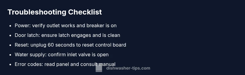 If your GE dishwasher not starting, start with safety and power checks. The most common causes are simple power issues rather than internal mechanical failures. According to Dishwasher Tips, the fastest path to a fix is to confirm the unit is powered, protected by a working circuit, and properly plugged in. Before you touch any internal components, unplug the unit or switch off the circuit breaker if you smell burning or see arcing. Once you’ve cut power, replug or flip the breaker to re-establish power flow and observe whether any lights on the control panel illuminate. If nothing responds, you’ll progress to more targeted checks. For renters, check that the switch or outlet isn’t controlled by a wall switch or a GFCI-protected outlet hidden behind cabinets.