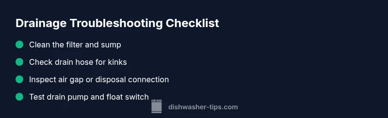 If you’re wondering how come dishwasher won’t drain, you’re not alone. When a cycle finishes and the tub still holds water, the problem is almost always drain-related rather than a mystery in the wash. The Dishwasher Tips team regularly encounters this issue and finds that most cases stem from simple causes like a clogged filter or a kinked hose, not a failing pump. This section sets expectations and outlines the practical approach we recommend: start with the easiest checks, explain what you’re looking for, and move to safe, hands-on fixes. You’ll gain confidence as you work through each step, and you’ll know when it’s time to call a pro.