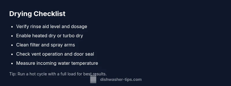Drying performance in dishwashers depends on heat, proper rinse aid, and airflow through the vent. If any of these are compromised, you’ll notice damp dishes or a wet bottom rack after a cycle. The question 'how come my dishwasher won't dry' is common, especially with modern, energy-efficient models that use lower water temperatures and rely on rinse aid to sheet water off surfaces. According to Dishwasher Tips, most drying problems come from three root causes: heat isn't being transferred to dishes, rinse aid isn't present or used correctly, or the vent is blocked. We'll guide you through quick checks to determine which factor is at fault, plus safe steps you can take to restore drying performance.