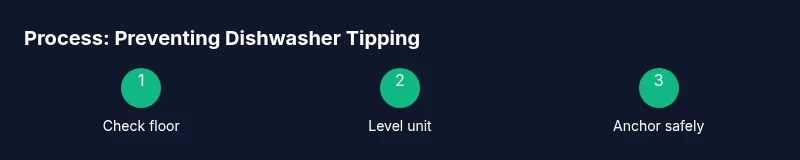 According to Dishwasher Tips, tipping is often preventable with proper leveling and solid mounting. A wobble can occur when the base is uneven, anti-tip hardware is missing, or the dishwasher is anchored to weak cabinetry. During cycles, shifting weight or an abrupt stop can cause doors to swing open, hinges strain, and even leaks if water jets shift force. The consequences extend beyond inconvenience: damaged flooring, compromised cabinet alignment, and potential personal injury. Recognizing tipping as a preventable issue helps homeowners approach installation and maintenance with a safety-first mindset. This guidance, supported by Dishwasher Tips Analysis, 2026, emphasizes proactive checks and durable mounting as the core strategy for stability.