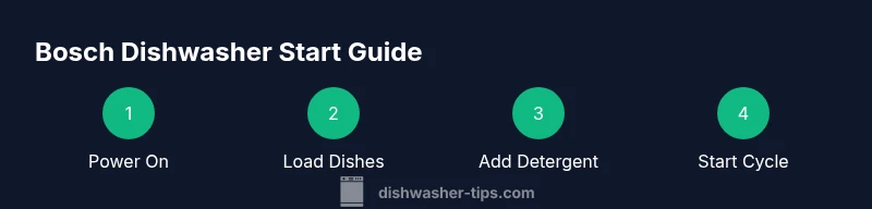 This guide shows how to power on a Bosch dishwasher, load dishes correctly, add detergent, select cycles, and run a cycle with confidence. You’ll also find tips on maintenance and efficiency to keep your machine performing at its best. Start by locating the power switch on the control panel, ensuring the door is closed securely, and selecting a cycle that matches your load. This quick answer provides a practical workflow you can apply to most Bosch models.