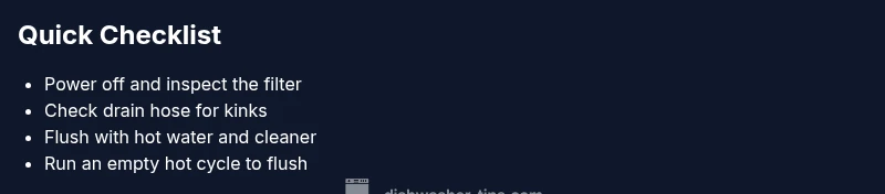 Steps to diagnose a clogged dishwasher drain start with the simplest checks: ensure the unit is powered, look for standing water after a cycle, and inspect the bottom filter and sump for debris. If you find buildup, remove it and run a hot-water cycle with a dishwasher cleaner. If the problem persists, move to the diagnostic flow and step-by-step fixes.