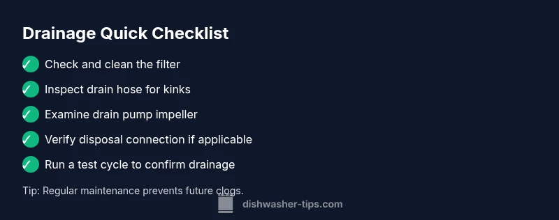 If the dishwasher is not draining, the issue is often a blockage in the filter or sump, or a kinked drain hose. This is particularly common in households with hard water deposits or frequent pebble-like food particles that slip through. The Dishwasher Tips team notes that many drain problems originate from simple blockages that you can clear with basic tools and careful cleaning. Debris can accumulate in the filter, Germany pump area, or even in a misrouted discharge line, creating a stubborn backflow that prevents proper drainage. Understanding these patterns helps homeowners act quickly and safely, reducing water exposure and file costs. In practice, most clogs are detectable with a visual inspection and a few routine tools, which makes DIY troubleshooting both feasible and time-efficient.