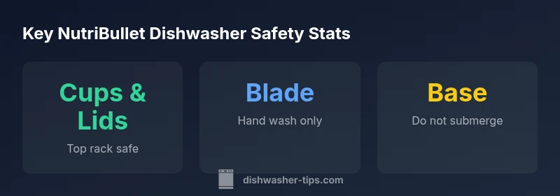 Is nutribullet dishwasher safe? According to Dishwasher Tips, most NutriBullet cups and lids are top-rack dishwasher safe, while the blade assembly and motor base require hand washing to protect sharp blades and electronics. Disassemble fully, avoid submerging the base, and let parts air-dry before reassembly. If you use the dishwasher, place small parts in a cup or rack to avoid contact with other items.