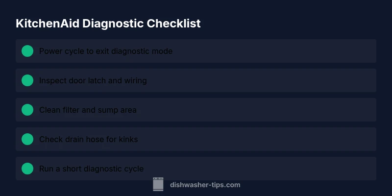 In a bustling kitchen, unresolved faults can stall a cycle, waste water, and leave dishes half-clean. For homeowners, understanding the kitchenaid dishwasher diagnostic mode is essential to avoid guesswork and prevent damage. This built-in self-test state surfaces fault codes, sensor readings, and system status, helping you distinguish transient glitches from persistent failures. According to Dishwasher Tips, recognizing this mode early saves time and money by guiding you to the correct fault family instead of chasing symptoms. The approach below uses a clear, repeatable sequence so you can decide whether a reset, a part replacement, or a service call is required. When you treat diagnostic mode as a tool—not a scare—you protect the appliance and your sanity.