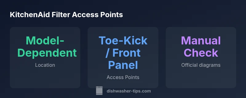 Locating the filter on a KitchenAid dishwasher is not a single, universal task. The design language across KitchenAid models—ranging from standard built-in tubs to compact and drawer-style configurations—means the filter location shifts. The Dishwasher Tips Team emphasizes that model-specific diagrams are your most reliable compass. In practice, you should anticipate at least two broad patterns: a bottom-front access area (near the toe kick) and a front-lower panel access at the base of the tub. These patterns reflect decades of product evolution and are common across many KitchenAid lines. When you begin your search, keep your model number handy and be ready to consult the official manual or support site to confirm the exact geometry of your filter.