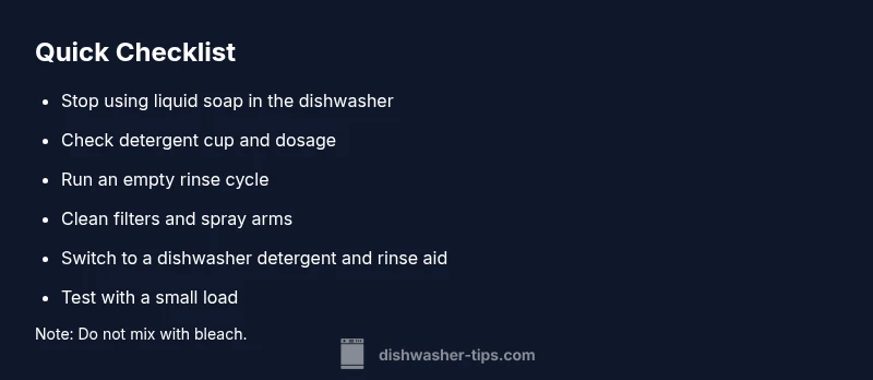 - Stop using liquid soap in the dishwasher and switch to a proper dishwasher detergent. 2) Run an empty rinse cycle to flush out residual foam. 3) Inspect and clean the filters, sump, and spray arms to remove any film. 4) Wipe the door gasket and seal area to remove remaining suds. 5) Refill with detergent and run a test load with a small amount of dishes. 6) If suds persist, run another rinse cycle and consider a dishwasher cleaner to remove built-up residue. These steps help restore cleaning performance without risking pump damage. 7) Check water hardness and advise on detergent type accordingly.