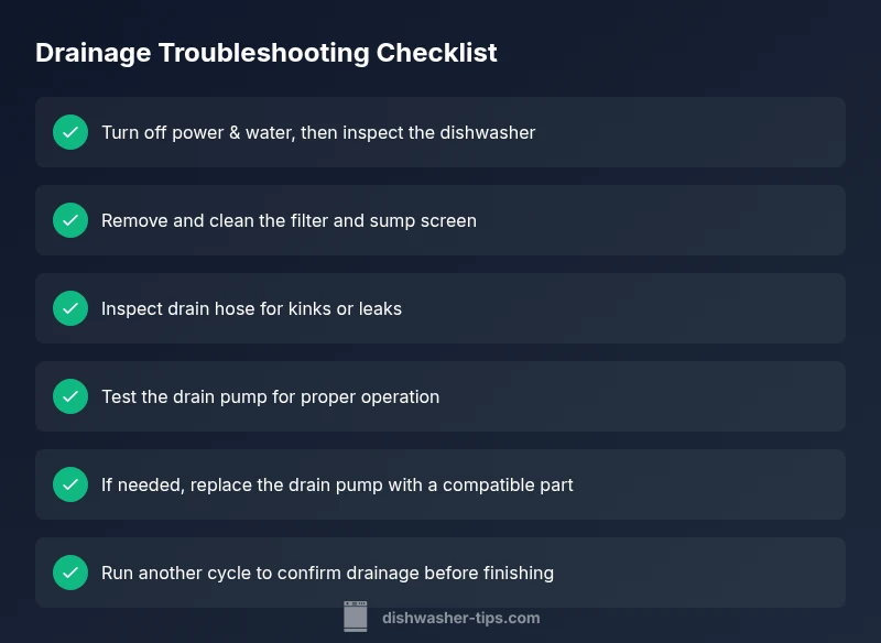 - Turn off power and water to the dishwasher. Remove the lower rack for access. 2. Remove and clean the filter and sump screen; rinse under running water until completely clear. 3. Reconnect and run a quick drain test to see if water exits the tub. 4. Inspect the drain hose for kinks or blockages; straighten and flush with water. 5. Listen for the drain pump during a drain cycle; test if possible with a multimeter or by observing for motor rotation. 6. If water still remains, consider replacing the drain pump or seeking professional help.