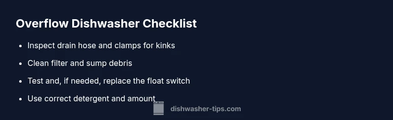 Overflow events happen when water escapes the tub during or after a wash. An overflow dishwasher can flood the kitchen floor if not addressed promptly. For homeowners and renters, this situation is both messy and alarming. The root causes are often straightforward: a clogged drainage path, a malfunctioning float switch, or a misbehaving detergent load that creates excessive suds. According to Dishwasher Tips, many overflow incidents begin with simple, fixable issues rather than expensive repairs. Start by observing whether water pours out of the door during wash, or if it spills when the pump engages. Visual checks are important: look for kinks in hoses, a standing pool of water in the bottom of the tub, and debris blocking the filter. If you catch it at the source early, you can prevent a flood and minimize damage. In most cases, a quick inspection of the drain system and the float assembly will identify the culprit. Stay calm, unplug the unit, and follow a methodical plan. Safety first in a kitchen with live electrical appliances is non-negotiable.