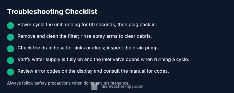 Unplug the dishwasher, wait 60 seconds, then plug back in. This resets most basic electronics and can clear temporary faults. If an error code remains, note it for reference.