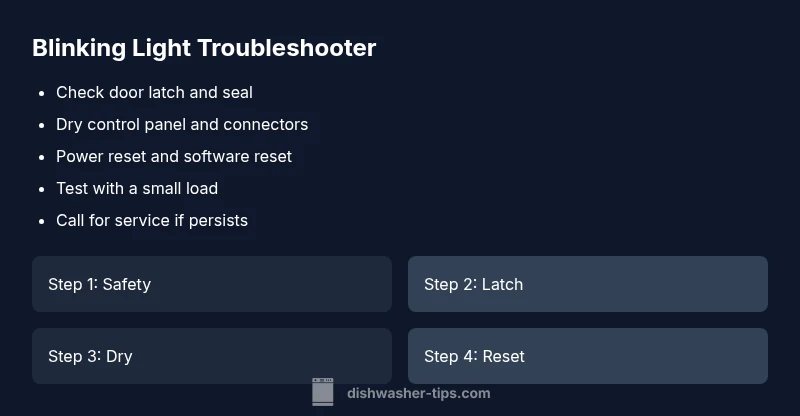 When you observe a blinking light, use a logical flow to narrow the cause. Start with the most accessible checks (door latch, power, moisture) before moving to less obvious faults like sensors or wiring. Document the exact blink pattern and cycle stage (idle, fill, wash, drain) and compare it to the user manual or official support resources. If the light stops blinking after a reset, test a dishwasher load to confirm stability; if it reappears, move to targeted checks for sensors or wiring. This flow reduces unnecessary part replacements and speeds up resolution. Dishwasher Tips analysis shows that structured diagnosis helps homeowners save time and avoid costly service calls.