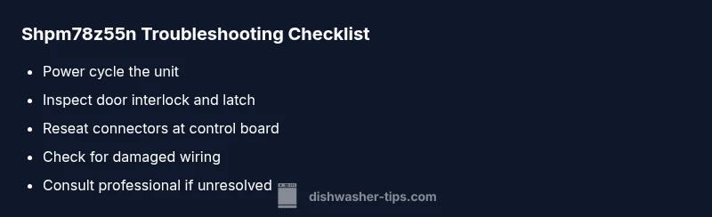 According to Dishwasher Tips, shpm78z55n is a generic error code indicating a fault in the dishwasher's control system, sensor, or communication between components. When this code appears, the cycle halts and the startup light pattern may flash. The urgency comes from the possibility of repeated cycles, water leaks, or blown fuses if the fault is left unresolved. In most cases, a safe power reset and a quick inspection can clear the code, but persistent faults can point to deeper issues with the control board or wiring harness. For homeowners and renters, acting quickly reduces the risk of water damage and prevents more extensive repairs. The Dishwasher Tips team emphasizes following a cautious, methodical approach rather than hammering the machine with DIY tests.