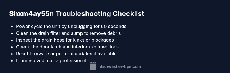 According to Dishwasher Tips, shxm4ay55n is a general error code that appears on many dishwashers when a cycle cannot complete due to drainage, door interlock, or control-board faults. The Dishwasher Tips team found that this code points to either a simple obstruction that blocks drainage or a faulty sensor that prevents safe locking of the door. In urgent situations, you should treat this code as a sign to stop the wash, unplug if you suspect a power issue, and begin a careful diagnostic flow. While the exact cause can vary by brand and model, the underlying pattern is that the machine believes there is a risk to safety or proper drainage, so it halts the cycle to protect parts and ensure user safety. Recognizing the common patterns behind shxm4ay55n helps homeowners move quickly from guesswork to action. We’ll cover the most likely causes, safe quick fixes, and when to call a professional if the code persists, with an emphasis on practical tools and procedures you can perform with basic household equipment.