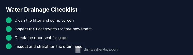 Common culprits and how to verify them\n\nTo narrow the cause, test each component in turn. The filter and sump screen: a clogged screen is by far one of the most frequent offenders; after cleaning, run a test cycle to observe drainage. Float switch: a stuck float can keep the sump from emptying; gently press the float arm up and down to feel resistance; if it doesn’t move freely, replacing the switch is often inexpensive. Door seal: a damaged gasket can leak water into the base; inspect for cracks or tearing and replace if needed. Drain hose: a crushed, kinked, or blocked hose prevents proper drainage; detach and inspect, then straighten or replace as necessary. Air gap: on homes with a sink-side air gap, a clog there will back up water into the dishwasher; disassemble and clean out any lint or debris. Dishwasher design varies; newer models include internal check valves that can fail, but the basic diagnosis remains the same: drainage flow is blocked somewhere along the path. Dishwasher Tips analysis shows that most drainage issues originate in the drainage path or seals and are often repairable without professional service.