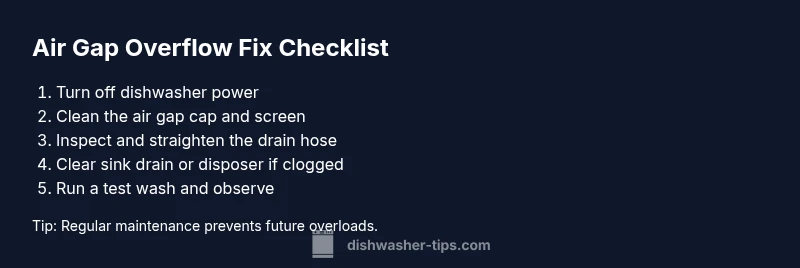 Most often, an overflow is caused by a blocked air gap or clogged drain hose that can't release wastewater properly. Start with the air gap and its cap, remove debris, and rinse. If the hose is pinched or clogged, straighten or replace it. If you still see overflow, inspect the sink drain and disposal for clogs.