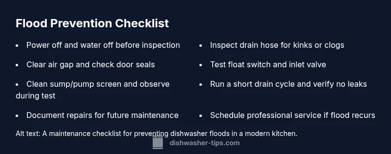 When a dishwasher floods, the root causes usually revolve around drainage or water level controls. A blocked drain hose, a stuck air gap, or a failing drain pump can allow wastewater to flow back into the tub and spill onto the floor. New installers sometimes misposition hoses, creating backflow, while aging gaskets and seals can leak water into the base. According to Dishwasher Tips, many floods originate from simple, user-serviceable issues such as a kinked hose or a clogged filter. Understanding these mechanisms helps homeowners act quickly and safely, reducing water damage and costly repairs.