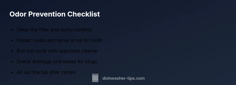 Keeping odors at bay starts with a simple routine you can implement this week. Regular maintenance reduces the frequency and intensity of smells and extends the life of your dishwasher. Begin with a monthly cleanup that targets the filter, sump, and door seal. Use warm water and a gentle but effective cleaner to remove buildup. After cleaning, rinse thoroughly and dry all surfaces to remove residual moisture. Consider running a hot sanitize cycle with a dishwasher-safe cleaner or a cup of white vinegar to disinfect the interior without damaging seals. Avoid long drips of standing water by wiping the bottom of the tub after each cycle. If your water is hard, numinous mineral buildup can contribute to odor; in such cases, a water softener or anti-scale product recommended by the manufacturer may help. Finally, keep the door slightly ajar after cycles to air out moisture and prevent mold growth.