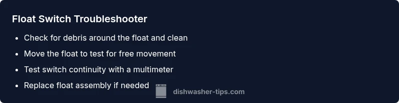 The float switch is a simple buoy that rises with the water level to tell the dishwasher when to stop filling. If the float cannot rise freely—due to grime, debris, a bent float arm, or a failing switch—the machine may overfill, underfill, or stop mid-cycle. According to Dishwasher Tips, understanding this component is essential for safe repairs. The Dishwasher Tips team found that most float-related issues stem from debris buildup or a mechanically stuck float, not from the control board. A healthy float also helps protect your kitchen from accidental floods, especially in compact or under-sink spaces where access is tight. When the float or its housing is blocked, even a functioning control board can’t correctly modulate the inlet valve, leading to inconsistent fill levels and potential water overflow.