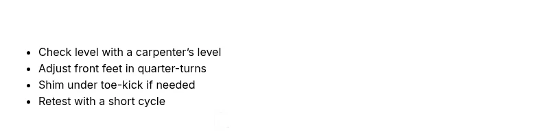 Slide the appliance back, re-test with the level across multiple points, and run a short cycle to observe leaks or movement.