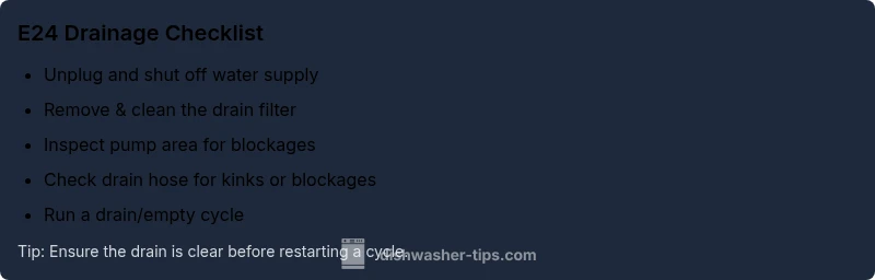 Before diving into deeper repairs, perform these quick fixes that address the most likely causes. Start by unplugging the unit and turning off the water supply for safety. Then: • Remove and clean the drain filter to clear food debris or scale buildup. • Check the drain pump area for blockages and ensure the impeller spins freely. • Inspect the drain hose for kinks, twists, or crushing that could impede drainage. • Run a drain or empty cycle to observe whether water clears from the tub. If the tub still fills or won’t drain, resetting the circuit (unplug for several minutes) can clear temporary sensor faults. These steps often resolve E24 without professional help, and they minimize downtime for your dishwasher. Dishwasher Tips recommends documenting each step you take, so you can report back if the problem recurs.