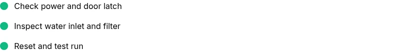- Start with power, door, and water supply checks before deeper testing.