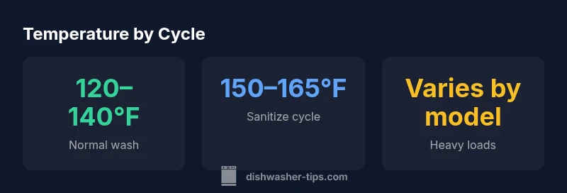 Most residential dishwashers heat water to about 120–140°F (49–60°C) during standard washes, while sanitizing cycles typically reach 150–165°F (65–74°C). Exact figures depend on model and cycle. To verify temperatures, consult your manual and, if needed, measure outlet water with a kitchen thermometer after a run. Understanding these temps helps you choose cycles that balance cleaning and energy use.