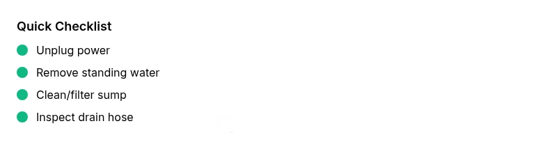 Most likely causes are a partial drain blockage or a clogged filter. Quick fixes: unplug the unit, remove standing water with towels, and clean the filter and sump screen. If water remains, check the drain hose for kinks, then run a short drain cycle to see if the pump clears.