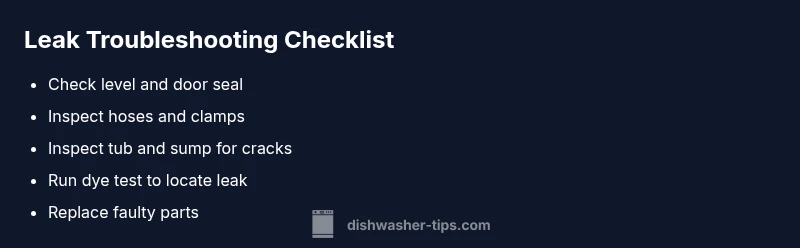 Start with the simplest checks: ensure the dishwasher is level and the door gasket isn't damaged. Then inspect hoses and the tub base for obvious cracks or loose connections. If you still see water, turn off power and water, then proceed to diagnostic flow below. For persistent leaks, professional help is advised.
