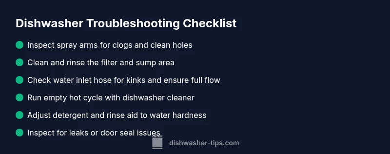 According to Dishwasher Tips, the most common culprits behind poor cleaning are restricted spray action, a clogged filter, and mineral buildup in the sump. Start with the simplest fixes to avoid unnecessary disassembly. By addressing these three areas first, you often restore cleaning power without professional help. This section will walk you through practical checks you can perform today, and how to interpret the results to decide if you should escalate.