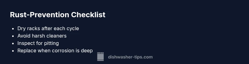 If you're wondering what to do when dishwasher racks rust, the key is recognizing that rust typically starts from ongoing moisture, mineral exposure, and age-related wear on metal components. According to Dishwasher Tips, many rust issues originate from small breaches in protective coatings and prolonged exposure to hot, humid dishwasher environments. When caught early, minor rust spots can be managed to extend rack life; when corrosion is deep, replacement becomes the safer option. Understanding these nuances helps homeowners act quickly and avoid dishes becoming contaminated with rust particles. This guide will walk you through practical checks, fixes, and prevention strategies to keep racks in service longer without risking equipment health or food safety.