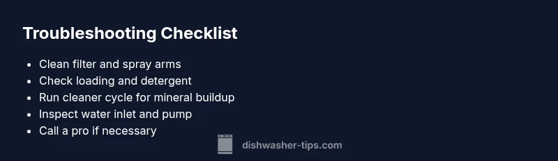 According to Dishwasher Tips, several everyday culprits cause a decline in cleaning performance. The most frequent are a clogged or dirty filter, obstructed spray arms, mineral buildup from hard water, and overloading or improper loading. These issues can reduce water flow, prevent detergent from circulating, and leave residue on dishes. The Dishwasher Tips team has found that addressing these items in order typically restores cleaning power without replacing the unit. Homeowners and renters alike benefit from a simple, repeatable routine: inspect and clean, then test with a normal load. Sustained problems may point to a worn pump, inlet valve, or failing heater, which require deeper diagnosis.