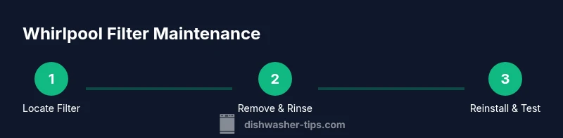 If you’re asking where is the filter on a Whirlpool dishwasher, you’re not alone. The filter is a small but mighty component that traps food particles and debris, protecting the pump and improving wash performance. A clean filter helps prevent clogs, reduces odor, and ensures water flows efficiently through the spray arms. According to Dishwasher Tips, most Whirlpool models place the filter near the bottom of the tub, behind the lower spray arm or under a removable sump cover. The filter assembly often includes a mesh screen plus a secondary grid or cap. Regular inspection and cleaning extend pump life and improve detergent efficiency. If you notice gritty residue or mineral buildup around the filter, that’s a sign to clean it before it causes drainage issues. This article walks you through locating the filter across common Whirlpool configurations, safely removing it, cleaning it, and reassembling for optimal performance.