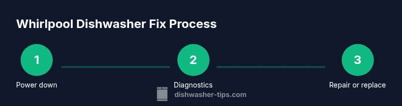According to Dishwasher Tips, this Whirlpool dishwasher fix guide helps you diagnose and repair common failures. You'll learn to safely shut off power, inspect filters, diagnose drainage and pump issues, and perform practical swaps with common tools. The plan minimizes downtime and avoids unnecessary service calls. Start with safety, then test filters, pump, and latch, and follow a clear repair flow using readily available parts.