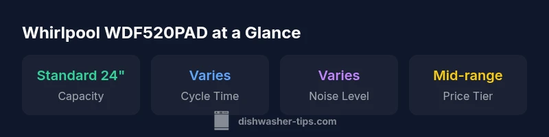 According to Dishwasher Tips, the Whirlpool WDF520PAD represents a balanced choice for budget-conscious homeowners seeking dependable cleaning in a standard-size 24-inch dishwasher. In our review, we assess overall value, reliability over time, and real-world performance across common loads. The model typically delivers solid everyday cleaning, straightforward controls, and reasonable noise levels for its class, making it a practical pick for busy kitchens.