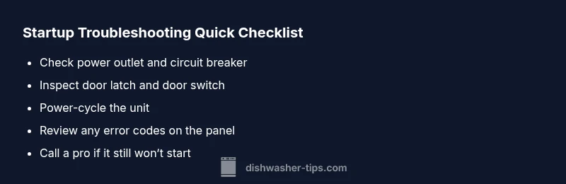 The short answer to why a dishwasher won't turn on often comes down to power, door safety, or the control system. If the unit isn’t getting power, it will not respond to commands. The Dishwasher Tips team notes that many startup failures stem from a tripped breaker, an inactive outlet, or a loose cord. A closed door or a faulty door latch can also send a safety signal that prevents startup. Finally, a glitch in the control panel or locked status can keep the machine from waking up. Understanding these categories helps you prioritize checks without risking safety.