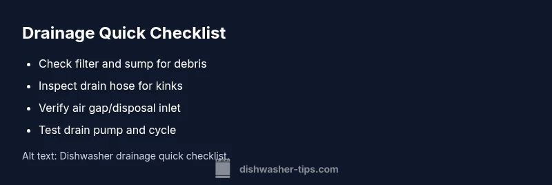 Dishwasher Tips analysis shows that most root issues fall into a few categories: filter debris, hose problems, air gaps, and pump faults. Following the diagnostic flow helps you prioritize tasks and avoid unnecessary repairs. Keep a simple checklist handy, and document what you test so you or a technician can pick up from the last known state.