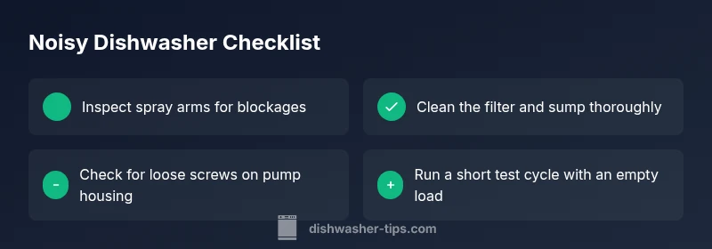 In most cases, the top culprit is a blocked spray arm or clogged filter. The following steps address that, plus a quick check for loose components. 1) Power down and unplug the unit. 2) Remove the spray arms and clean any debris, and verify they spin freely. 3) Clean the filter and sump; rinse until clear. 4) Inspect the pump area for debris and tighten mounting screws. 5) Reinstall racks and run a test cycle with empty load to confirm reduced noise. 6) If the noise persists, escalate to the next level of inspection or contact a professional. This sequence minimizes risk while focusing on high-impact fixes.