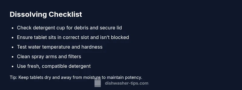 After completing any fix, run a full cycle on hot water with a standard load. Inspect the dishes for any residue and confirm the tablet fully dissolved. If you still observe undissolved particles, document the pattern (cycle used, tablet brand, and load type) and compare with other cycles or brands. Keeping a simple log can help you detect whether the issue is intermittent or linked to a specific brand or water condition. Finally, consider scheduling a professional check if your dishwasher is older than eight years or if you notice recurring problems.