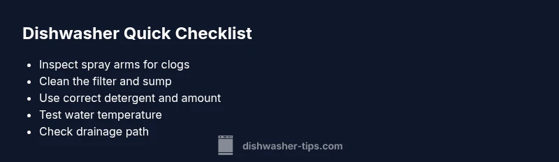 According to Dishwasher Tips, the frustration of a dishwasher that won't clean often starts with simple, fixable culprits. The very first suspects are the intake and spray systems: blocked spray arms, a clogged filter, or mineral buildup on nozzles. If water can't reach the dishes or is dispersed unevenly, food may remain on utensils. If you’re wondering, “Why is my dishwasher not cleaning?”, start with a quick visual check: remove the spray arms and look for hair, food particles, or mineral deposits. Use a flexible brush to clear holes; rinse under warm water. Next, examine the filter and sump screen: any crumbly debris or broken mesh reduces circulation and cleaning power. Clean or replace the filter according to the manufacturer’s guidance. Also verify you are using the correct detergent and amount; too little detergent or an incompatible product can fail to emulsify grease. If you suspect hard water, consider a rinse aid and possibly a descaler. Finally, ensure the dishwasher is loaded properly: overcrowding blocks spray arms and prevents water from reaching the bottom rack. By starting with these fundamental checks, you can often solve many not-cleaning issues without tools.