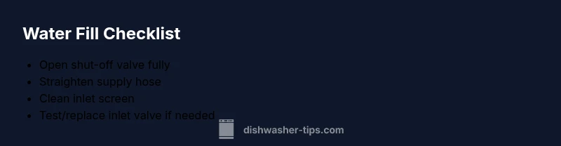 Safety first: unplug the unit or switch off the circuit breaker before touching any internal components. Then turn off the home’s water supply to the dishwasher. If your model has a service panel, remove it to access the fill valve and inlet hose. Look for obvious signs of trouble: a valve that’s not fully open, a hose that’s pinched or bent, or corrosion around electrical connectors. If you feel uncertain, stop and call a professional. The goal is to confirm whether the problem is upstream (water supply) or downstream (valves and sensors) before you replace parts.