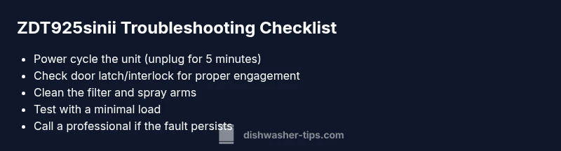 ZDT925sinii is a general fault code read by your dishwasher's control board. It signals a fault that can involve safety interlocks, sensors, or the control board. The quickest fixes are a power reset, checking the door latch, and cleaning the filter and spray arms. If the code persists, unplug the unit and inspect connections before calling Dishwasher Tips.