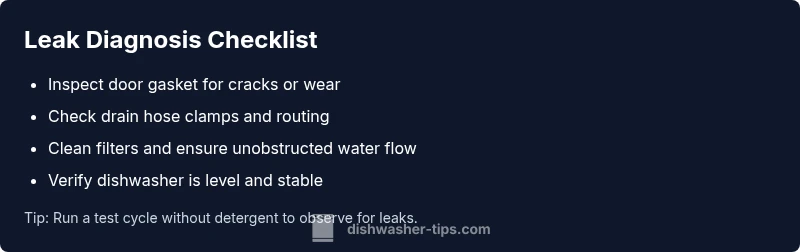 A systematic diagnostic flow helps you map symptoms to probable causes. Start with the simplest checks: inspect the door seal for wear, verify that the drain hose has secure clamps and is not kinked, and confirm the dishwasher is level. If the door gasket shows wear but the hose seems fine, replace the gasket and re-test. If leaks persist, inspect the inlet valve and fill hoses for leaks or cracks and replace as needed. For persistent issues not tied to hoses or seals, consider tub damage or internal pump failure as a more serious problem. Always document findings as you go to guide future maintenance and to communicate clearly with a technician if you need it.