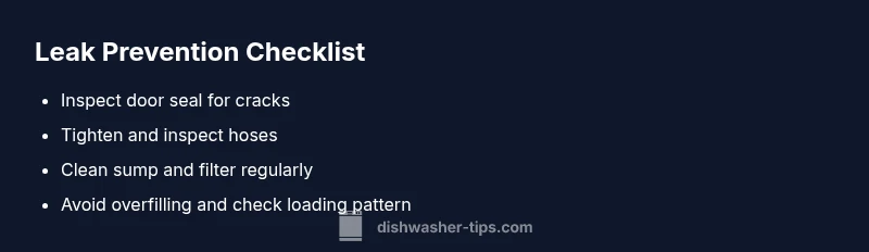 Dishwashers are intricate appliances that rely on seals, hoses, and precise water levels to operate cleanly. When a leak occurs, it’s usually a sign that one or more components have worn out or shifted during cycles. According to Dishwasher Tips, the most common leaks begin at the door gasket, but other culprits can include loose supply hoses, a damaged drain hose, or an overfilled tub. A small crack in the tub or sump can also manifest as water pooling at the base after a cycle. Understanding these patterns helps homeowners diagnose the issue quickly, plan the repair, and minimize water damage. Regular maintenance—like inspecting seals and cleaning filters—greatly reduces sudden leaks and extends the life of the machine.
